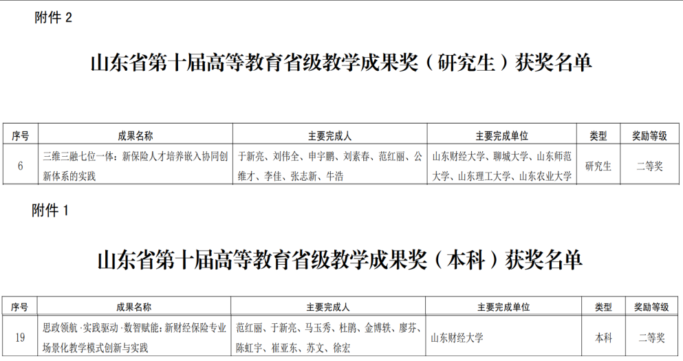 近日,山东省教育厅印发《第十届高等教育省级教学成果奖获奖名单的通知》(鲁教高函〔2025〕30号),我院再添省级教学荣誉,共有两项教学成果获评省级二等奖。其中,于新亮教授主持的《三维三融七位一体:新保险人才培养嵌入协同创新体系的实践》荣获研究生教学成果二等奖,范红丽教授主持的《思政领航・实践驱动・数智赋能:新财经保险专业场景化教学模式创新与实践》荣获本科教学成果二等奖。