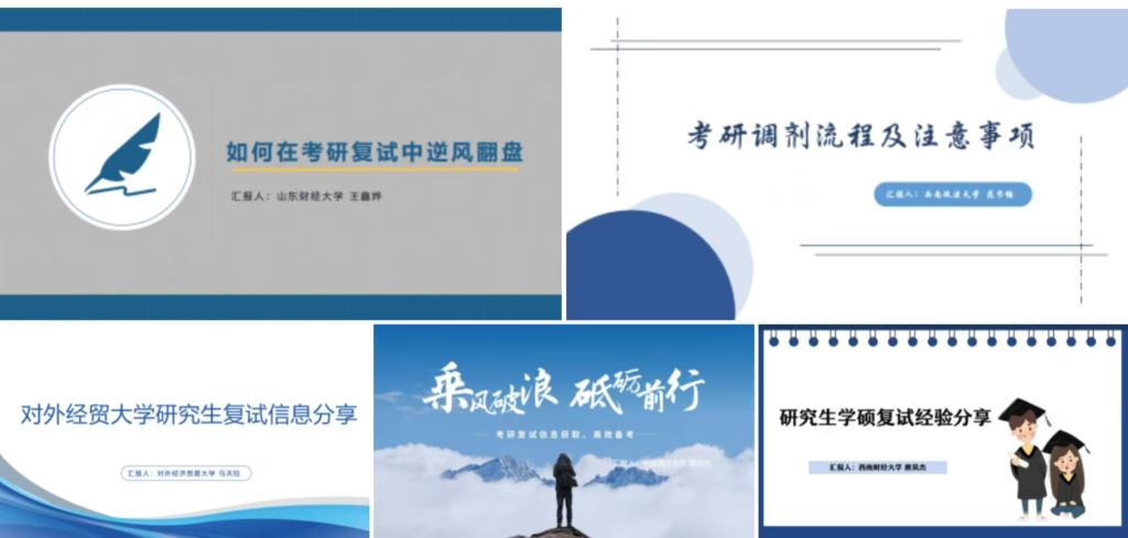 第二阶段五位2024届毕业生对同学们进行了多维度主题分享,对外经济贸易大学马天钰、中国海洋大学高怡凡、西南财经大学唐昊杰、西南政法大学范书畅和山东财经大学王鑫烨同学分别就复试分数线趋势、复试前的信息获取与复习准备、保险学硕复试注意事项、调剂关键节点及意向采集、保险专硕高频考点进行了主题分享,并祝愿所有参加复试的同学们都能取得优异的成绩。会议最后,设置了答疑环节,参会同学能够针对自己的实际情况进行提问。