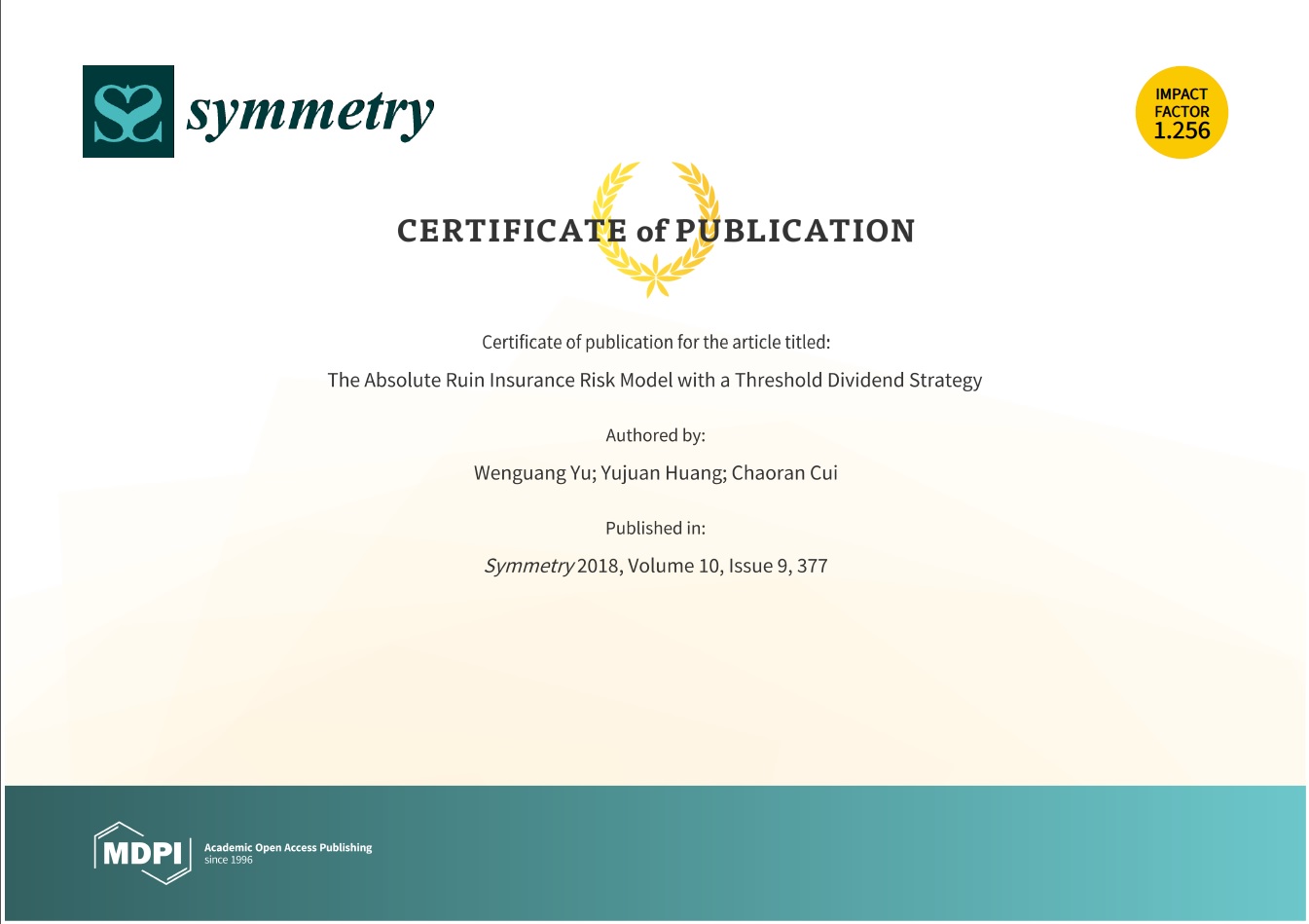 近日,我院于文广教授以第一作者和通讯作者身份在A1类期刊《Symmetry》2018年9期10卷上发表论文《The Absolute Ruin Insurance Risk Model with a Threshold Dividend Strategy》,该期刊JCR分区为2区,影响因子高达1.256。这是于文广教授本年度发表的第二篇A1类论文。第一篇论文《基于年龄与工资水平差异的延迟退休对我国养老保险基金收支平衡的影响》于2018年2月在《中国软科学》上发表。