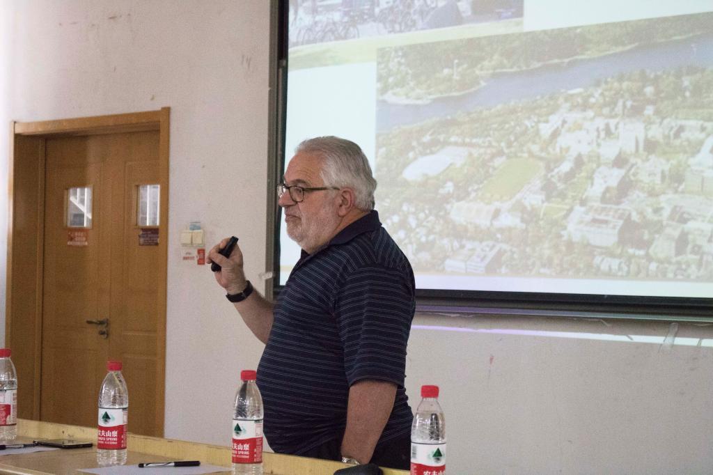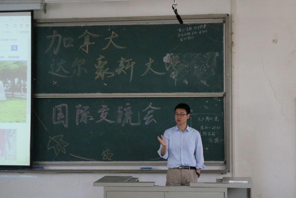 柏瑞通过PPT向同学们介绍了达尔豪斯大学,包括校徽、地理位置、学校环境、师资力量等方面。他还强调了达尔豪斯大学国际交换生高达20%的比重以及达尔豪斯大学在知名度方面的优势。因此,他希望有越来越多的国际学生来达尔豪斯大学读书,从而建设成为国际性大学。