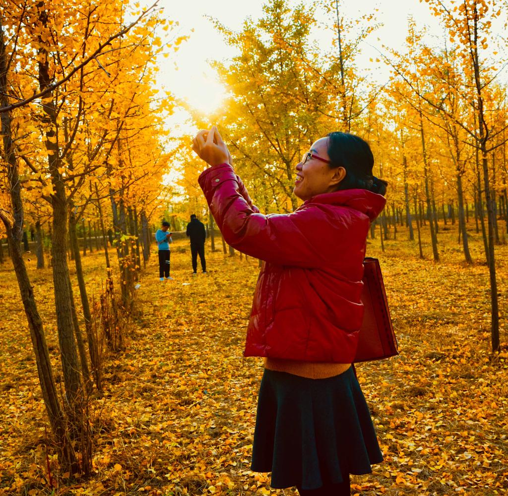 下午3时许,老师们又来到黄河银杏林。深秋季节,济南黄河银杏林也是最佳观赏期,数万米的银杏林像披上了金黄色外衣,在阳光的照耀下熠熠生辉,落在地上的银杏叶像是给大地盖上了一层柔黄的地毯。徜徉在金灿灿的世界里,老师们或拍照或欢笑或交谈,偶尔捡拾起一颗银杏果,一派一家亲的温馨和谐。