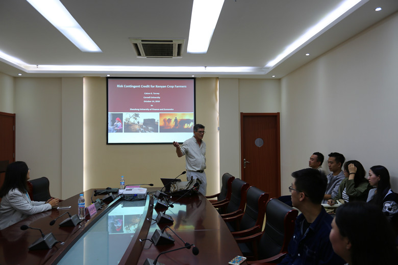 10月14日下午三点半,康奈尔大学研究生院副院长、应用经济与管理学院Calum Turvey教授来我院作了题为“Risk Contingent Credit for Drought Risk”的精彩学术报告。讲座在舜耕校区实验楼407举行,保险学院师生聆听了讲座。