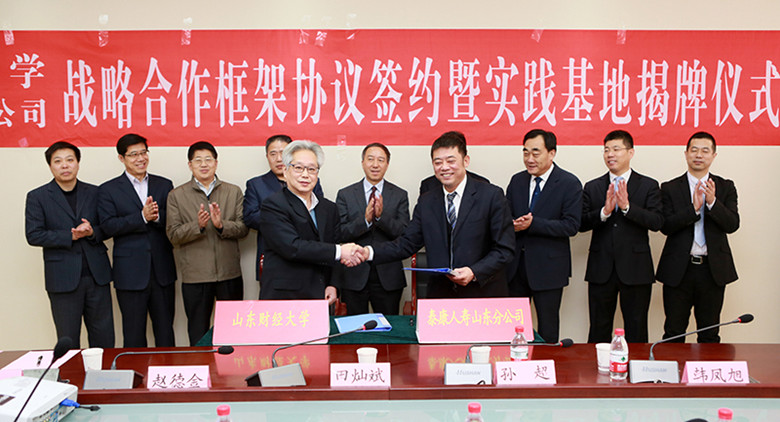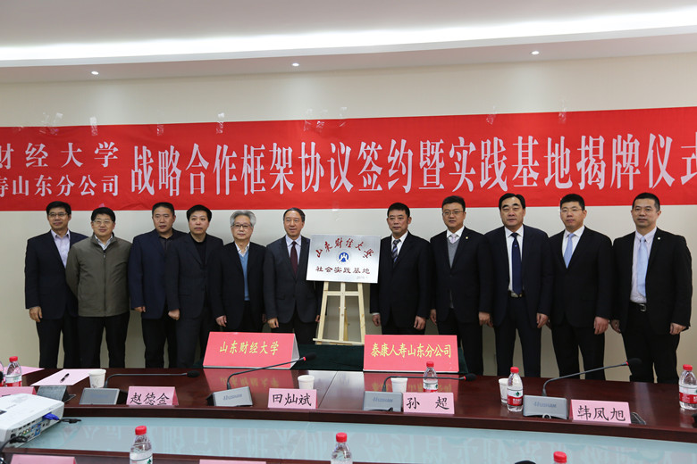 (编辑:李磊)1月26日上午,山东财经大学、泰康人寿保险股份有限公司山东分公司战略合作协议签约暨社会实践基地揭牌仪式在舜耕校区举行。泰康人寿山东分公司总经理田灿斌,副总经理孙超、赵德金、韩凤旭,山东财经大学校长卓志、副校长胡文波出席仪式,学校有关部门负责人和保险学院师生代表参加了签约仪式。