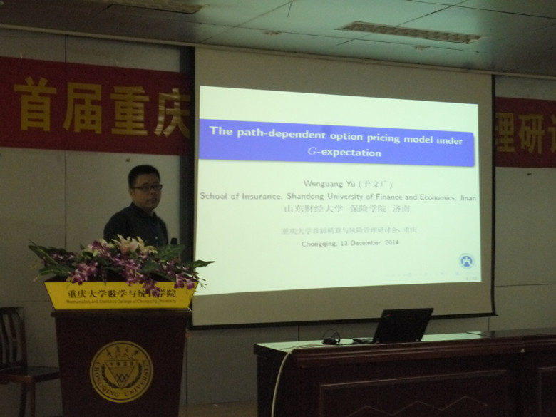 2014年12月13-14日,重庆大学举办了首届精算与风险管理研讨会,来自全国100多位保险精算领域的专家、学者参加了会议,共有23人在会上作了报告,我院教师于文广在大会上作了《The path-dependent option pricing model under G-expectation》的专题报告。