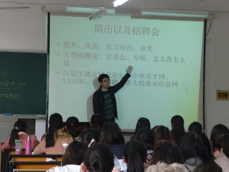 两位优秀毕业生谭健、李骁分别签约中国人民银行武汉分行和中国工商银行佛山分行,谭健简要分析了当前毕业生所面临的就业难问,李骁阐述了面试中的相关技巧和银行的笔试分类。