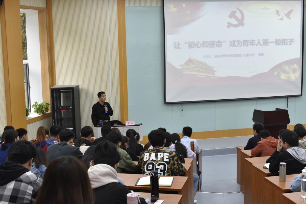 10月24日下午,学校党委委员、纪委书记姜波以“让‘初心和使命’成为青年人第一粒扣子”为主题,在舜耕校区第三阶梯教室为保险学院、体育学院150多名学生党员、党员发展对象、入党积极分子上了一堂生动的党课。