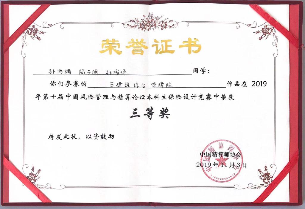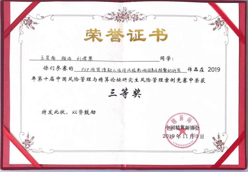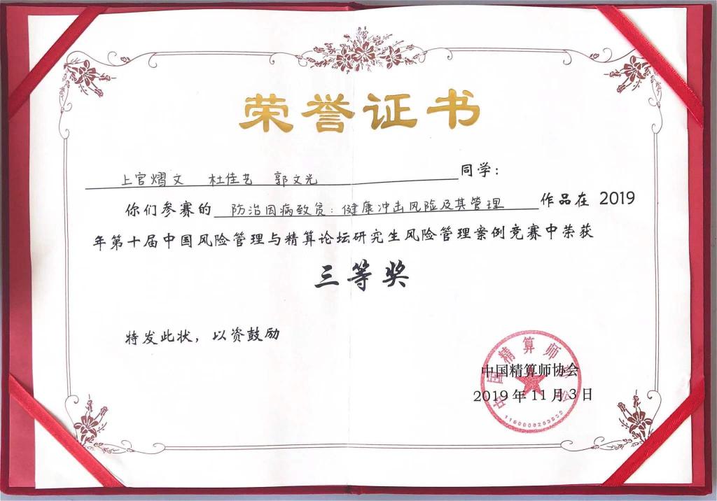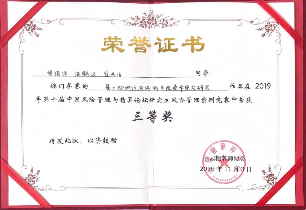 通过精心有序的作品展示和紧张激烈的答辩,最终我院三支本科生团队和三支研究生团队分别在全国30支本科生参赛团队和20支研究生参赛团队中脱颖而出。本科生三支团队分别获得一二三等奖,研究生三支团队均获得了三等奖,获奖整体情况名列前茅。本科生竞赛方面,李泽鑫、卢舒、宋雅姝的参赛作品《UBI模式下的新型共享汽车综合险》(指导老师:于文广)在本科生竞赛中荣获一等奖,张程荷、谭轶丰、李冰的参赛作品《新型骑手意外综合险》(指导老师:于文广)在本科生竞赛中荣获二等奖,孙雨桐、陆子晗、孙鸣泽的参赛作品《古建筑综合保障险》(指导老师:于新亮)在本科生竞赛中荣获三等奖。研究生竞赛方面,管国锋、熊麟波和翟来洁的参赛作品《基于BP神经网络的车险费率厘定研究》(指导老师:于文广),王昊南、陶冉、刘增慧的参赛作品《P2P网贷借款人信用风险影响因素及预警的研究》(指导老师:丁德臣),上官熠文、杜佳艺、郭文光的参赛作品《防治因病致贫:健康冲击风险及其管理》(指导老师:于新亮)在研究生竞赛中荣获三等奖。
