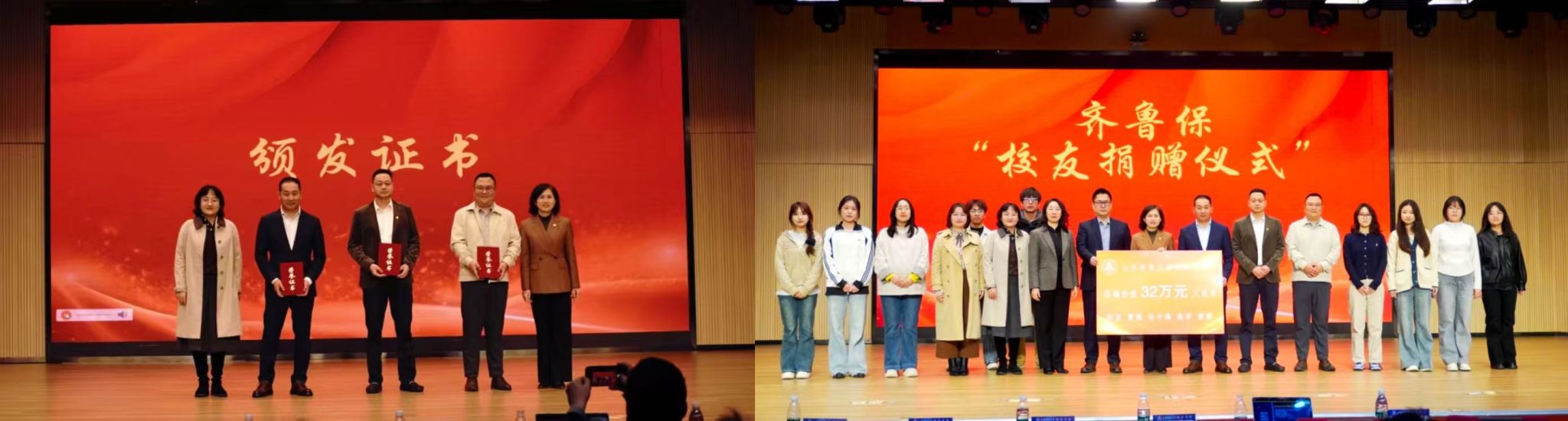 4 月 9 日,山东财经大学保险学院 “情系母校,共筑未来 —— 齐鲁保校友捐赠仪式” 在章丘校区文化活动中心报告厅举行。山东财经大学校外导师陈卫华博士,华安财产保险股份有限公司聊城分公司总经理、保险校友会副会长高军,诺诚保险代理有限公司总经理、保险校友会秘书长孙中峰,济南文杰文心信息科技有限公司总经理、保险校友会副秘书长曹植、保险学院党委书记张娟、党委学生工作部副部长刘娟、学院党委副书记王斐斐,学院辅导员及学院师生代表参加活动,仪式由王斐斐主持。