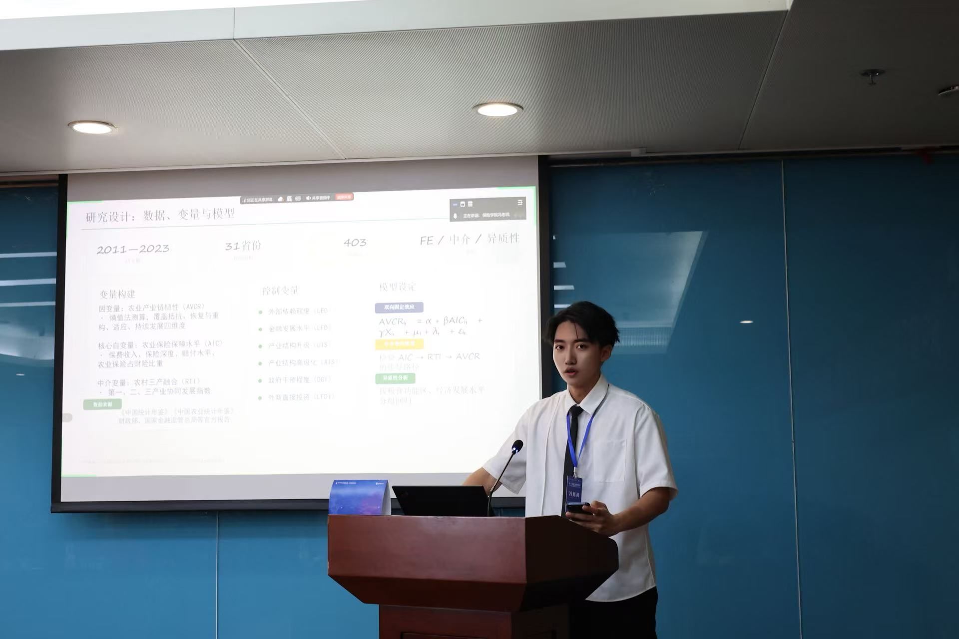 在分论坛报告环节,我院教师和研究生分别围绕各自研究领域发表了学术见解。其中,范红丽教授与硕士研究生麻睿欣合作完成的论文《科技保险能否激励企业创新?——来自中国上市公司的经验证据》,刘素春教授与硕士研究生朱建涛、刘浩哲的论文《数字经济对农业保险高质量发展的影响研究》,廖芬副教授与硕士研究生冯旭初的论文《农业保险对农业产业链韧性的影响研究》,以及本科生邓善宝的论文《基于融合PSO算法的随机森林模型的长期护理保险定价研究》分别入选并作现场汇报。师生们的研究视角多元、论证扎实,充分展示了我院在保险学科领域的系统性研究积累和持续的学术创新能力。