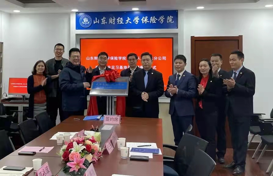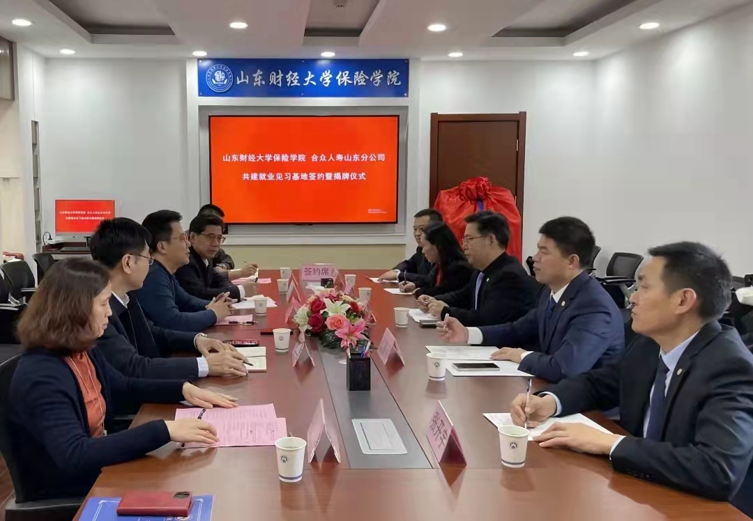 2021年12月2日上午,山东财经大学保险学院与合众人寿保险股份有限公司山东分公司共建就业见习基地签字暨揭牌仪式在学院会议室举行。合众人寿保险股份有限公司山东分公司总经理杨玉宪、人力资源部经理王景亮、财务部经理郭燕、行政部经理张开宇、运营部经理杨宁波以及山东财经大学就业指导处处长杨哲、山东财经大学保险学院党委书记朱传武、院长葛永波、党委副书记张娟、就业办主任陈萌等参加签约揭牌仪式,仪式由张娟副书记主持。