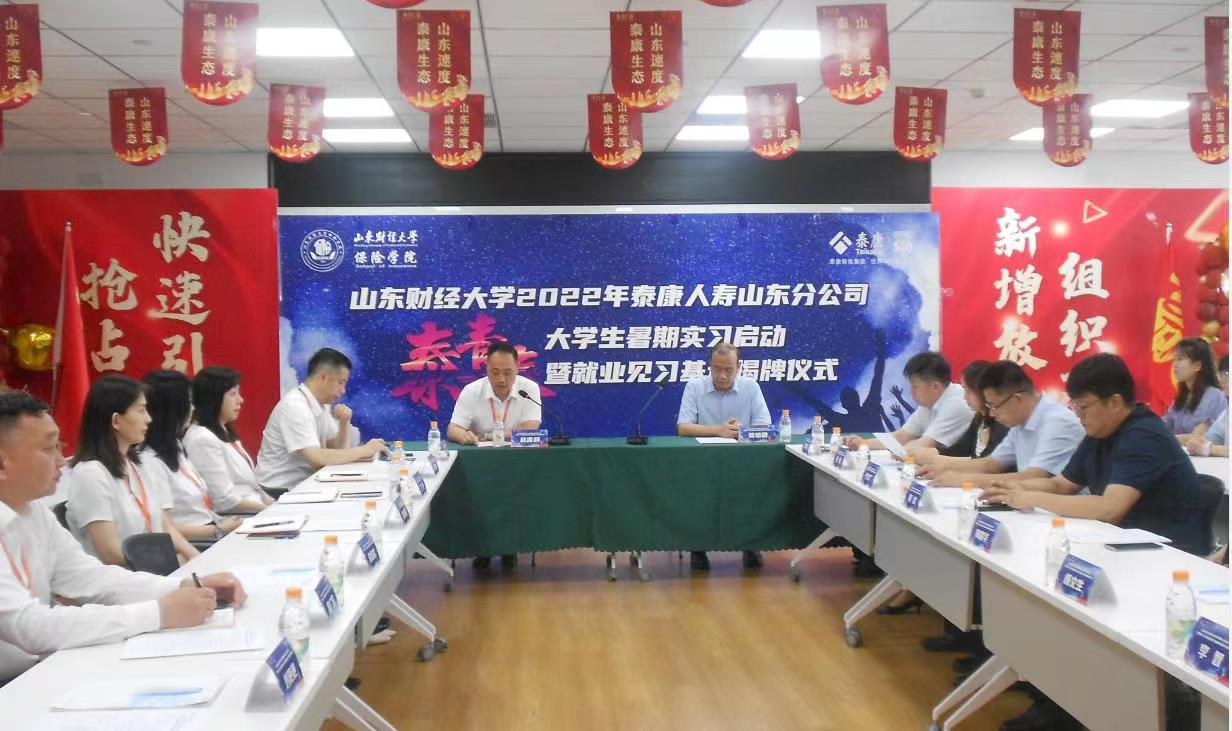 张培国一行与公司代表共同参加了山东财经大学2022年泰康人寿山东分公司“泰青春”大学生暑期实习启动仪式暨就业见习基地揭牌仪式。仪式上,大家观看了泰康人寿公司主题宣传片,泰康人寿山东分公司人力资源部经理许国松做“泰青春”大学生实习培养计划介绍。随后,张培国为大学生暑期实习团授旗,张培国、夏胜斌共同为山东财经大学就业见习基地揭牌。今年7-8月份,保险学院共有84名学生参加泰康公司暑期实习,其中研究生10人,本科生74人,分布在济南、烟台、潍坊、淄博、东营、聊城、日照、临沂等多个地市。