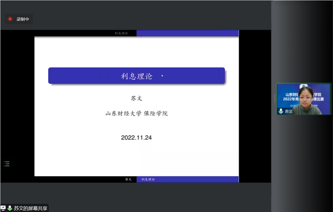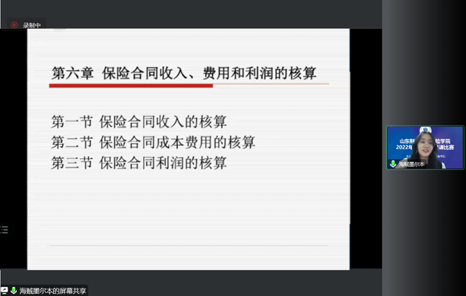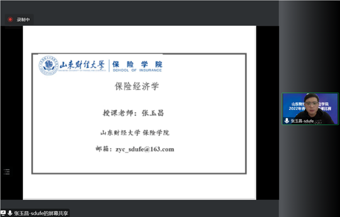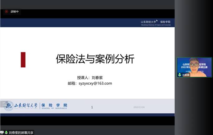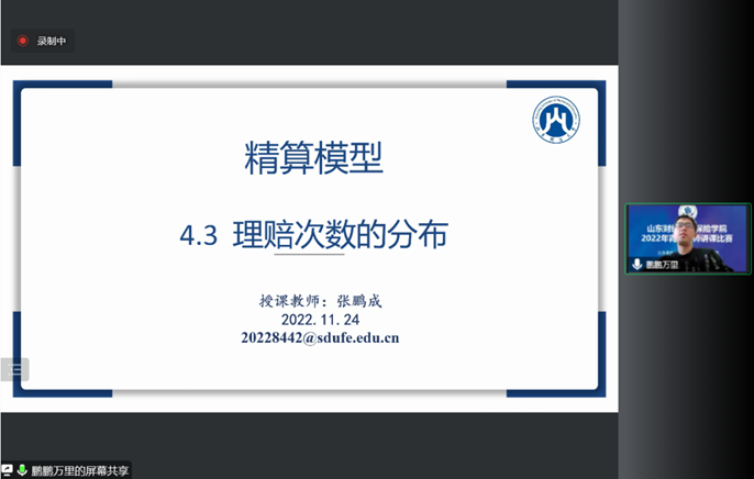 比赛由山东财经大学保险学院副院长于新亮教授主持。比赛开始前,于新亮副院长详细介绍了本次比赛的比赛顺序、规则以及打分标准。九位青年教师依次进行讲课展示。讲课内容涉及保险学、利息理论、保险会计、保险经济学、人寿与健康保险、精算模型、保险法与案例分析等多个专业核心课程的主要章节和知识点。七位评委严格按照评分规则进行打分,崔宝敏教授和孙秀清教授分别作为院外和院内评审专家代表做总体评价,并从青年教学比赛的竞争模式、授课过程的技巧运用以及如何提升课程讲课质量等多个方面提出改进建议。