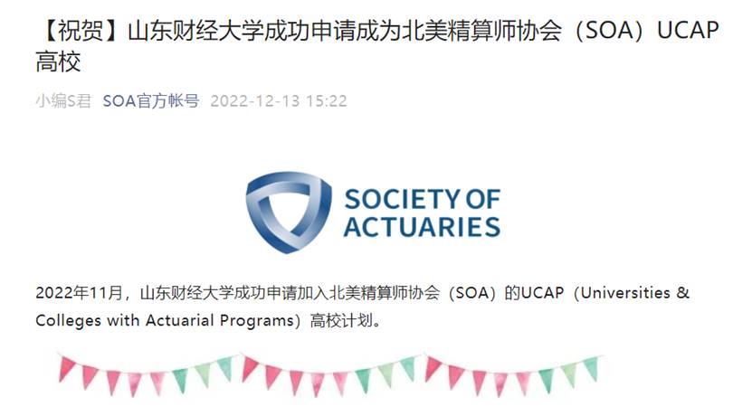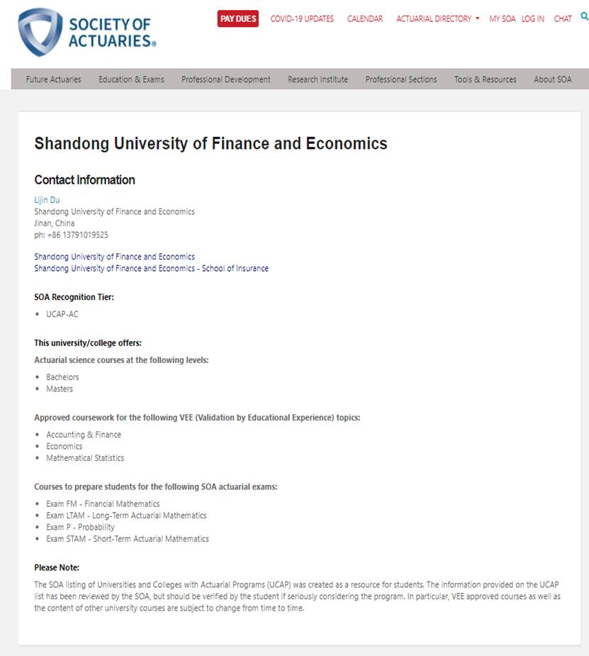 近日,北美精算师协会(Society of Actuaries,简称SOA)官方网站公布,山东财经大学保险学院精算学专业正式获得SOA的UCAP高校计划(Universities & Colleges with Actuarial Programs)认证,这进一步提升了我院精算学专业的国内外知名度,也标志着我院精算学专业的本科国际化教育已获得国际认可。