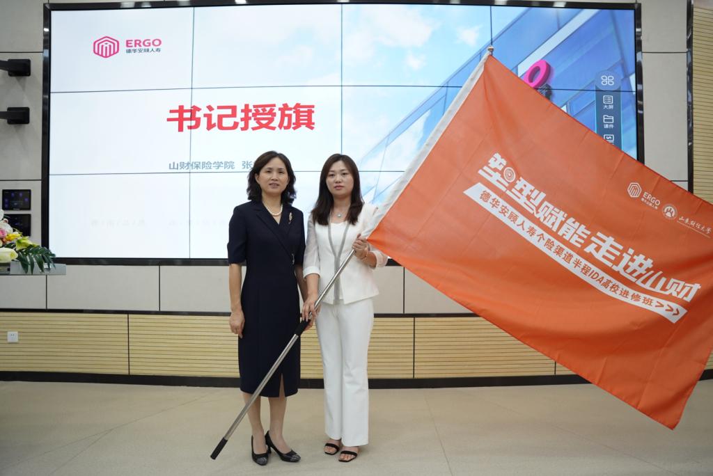 在接下来的授旗仪式上,山东财经大学保险学院党委书记张娟向学员代表吴越授予进修班班旗。