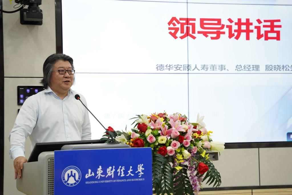仪式最后,德华安顾人寿保险有限公司董事、总经理殷晓松致辞。他详细介绍了德华安顾人寿与山东财经大学的合作渊源和一系列深度交流,结合当前保险行业发展形势以及未来发展方向,指出应通过实施“个险+代理人”战略把握行业转型先机,进而走出一条差异化的可持续发展之路,并鼓励各位保险代理人既要提升外在,也要提升内在,不断开拓自我、努力探索并提升服务品质。