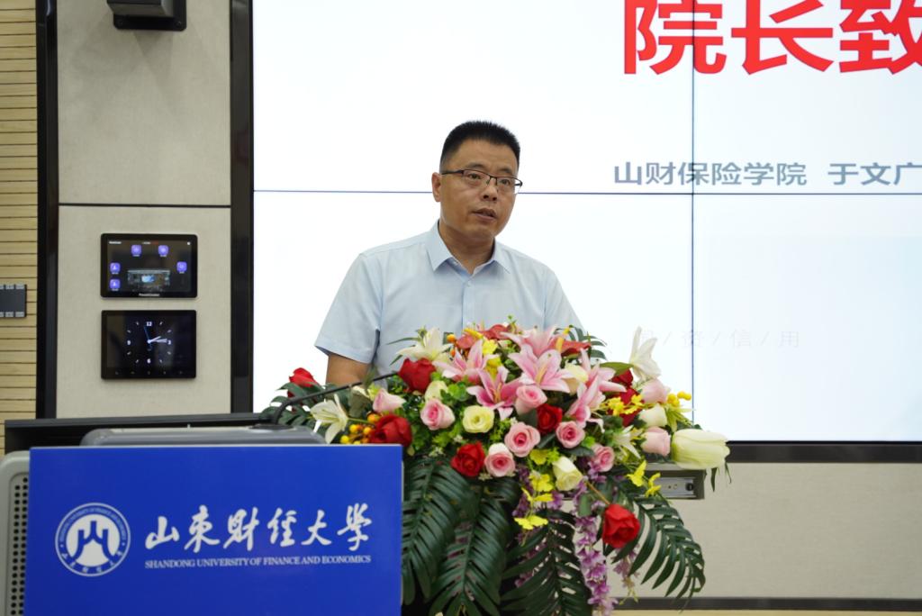 山东财经大学保险学院院长于文广致欢迎词。他首先对各位领导和学员的到来表示热烈欢迎,随后简要介绍学校发展历程和学院学科建设特色,并表示此次培训将是校企深化战略合作的又一重大成果,期望双方以此次合作培训作为新的合作契机,为双方加强校企合作、提升社会服务、促进共同发展提供更加宝贵的经验,共同打造应用技能人才培养新高地。