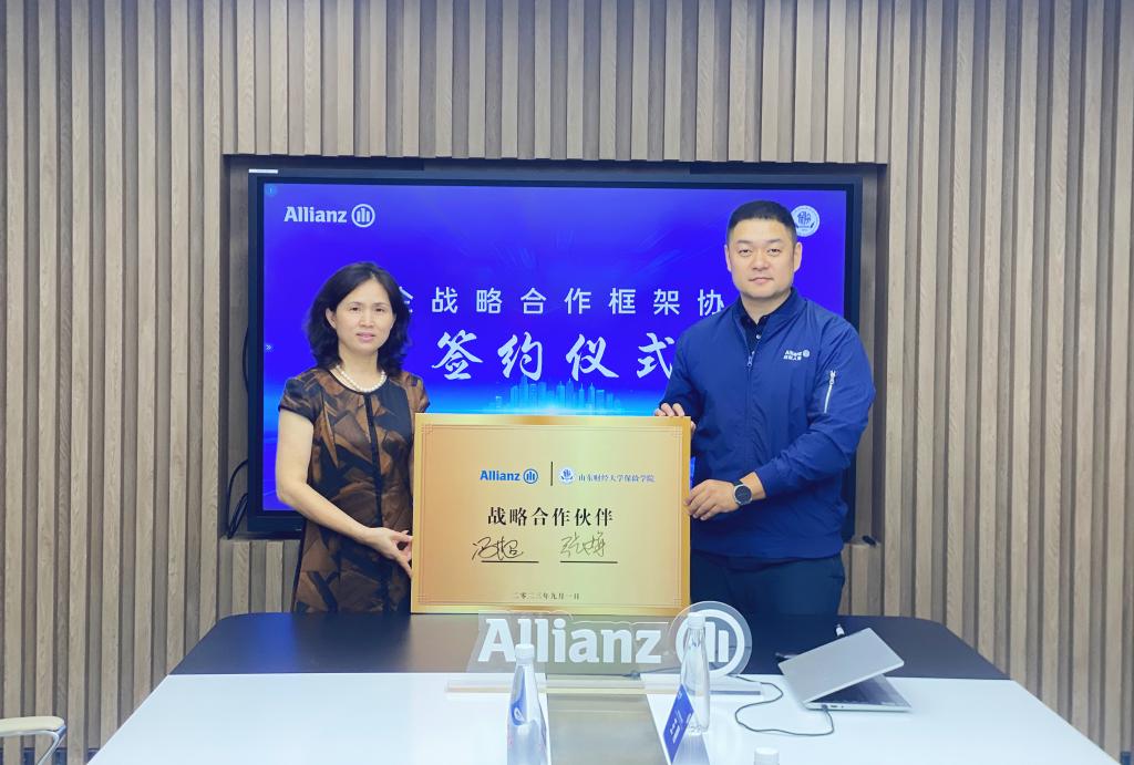 保险学院院长于文广与安联人寿保险山东分公司负责人冯立超分别代表双方签订校企战略合作框架协议书,保险学院党委书记张娟为安联人寿保险山东分公司战略合作伙伴授牌。