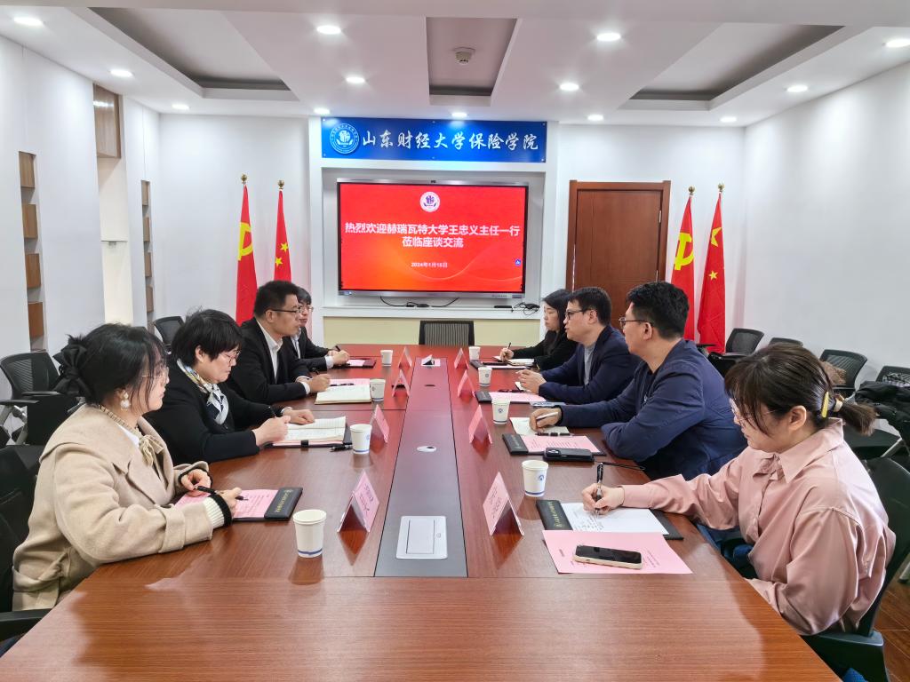 2024年1月15日下午,英国赫瑞—瓦特大学东亚办公室主任王忠义一行来我院座谈交流。山东财经大学国际交流与合作处副处长马晓倩,保险学院院长于文广,副院长刘素春、于新亮与客人进行会谈,保险学院和国际交流与合作处相关负责人员参加会谈。座谈会由刘素春主持。