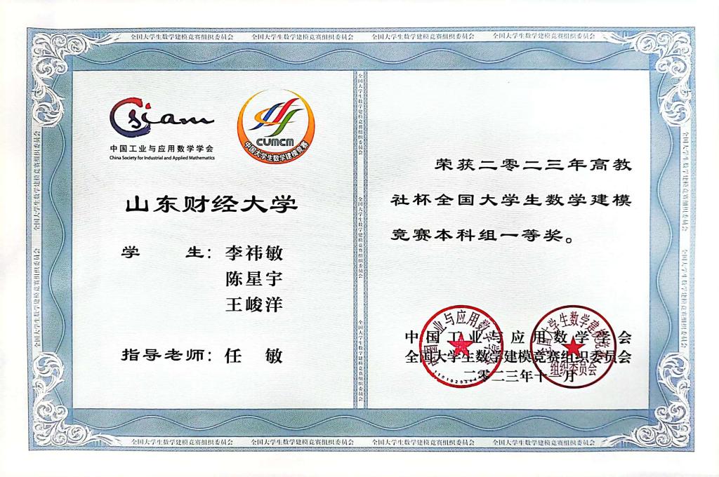 日前,2023年全国大学生数学建模竞赛成绩公布,我校报名参赛的76支队伍共获32项奖项,其中,全国一等奖1项,省级一等奖9项、省级二等奖16项、省级三等奖6项,学校被评为“山东赛区优秀组织单位”。我院2021级精算学专业李祎敏同学及其团队在2023年全国大学生数学建模竞赛中斩获国家一等奖,创造了我院本科生在该赛事中的最好成绩。据统计,全国大学生数学建模竞赛全国一等奖获奖率仅为0.55%。