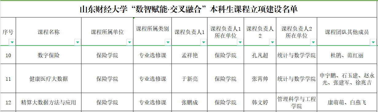 根据《关于开展山东财经大学“数智赋能·交叉融合”本科生课程立项建设工作的通知》的要求,学校组织专家对各学院(部)推荐参评的课程及申报材料进行了严格、公正的审核与评议。根据评审结果,确定立项建设50门“数智赋能·交叉融合”本科生课程。其中,我院教师于新亮申报的《健康医疗大数据》、张鹏成申报的《精算大数据方法与应用》和孟祥艳申报《数字保险》成功入选。