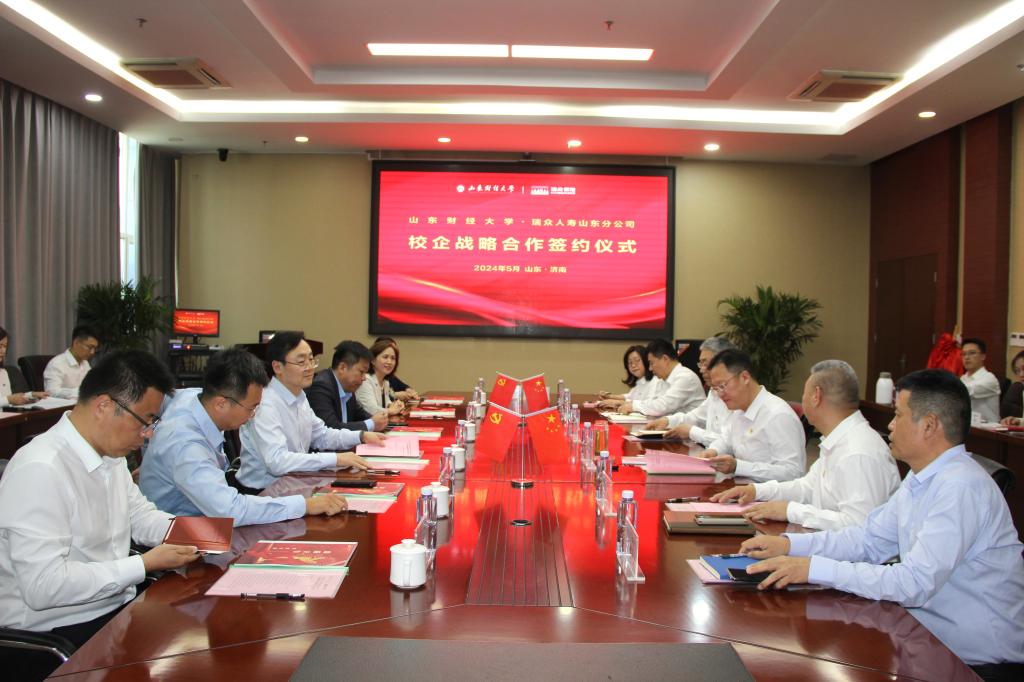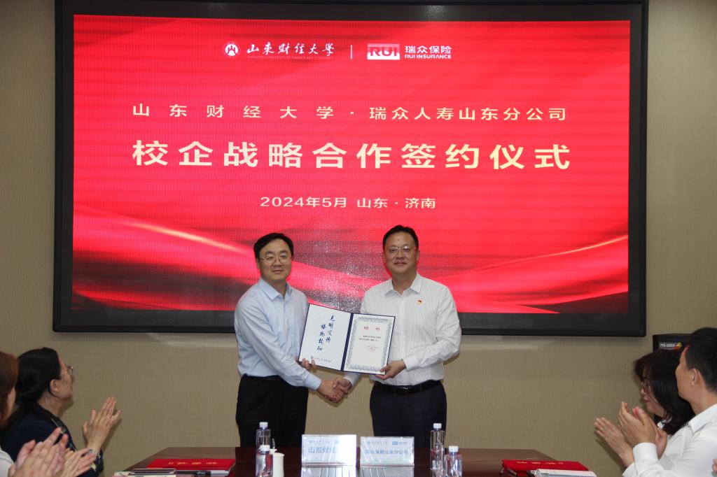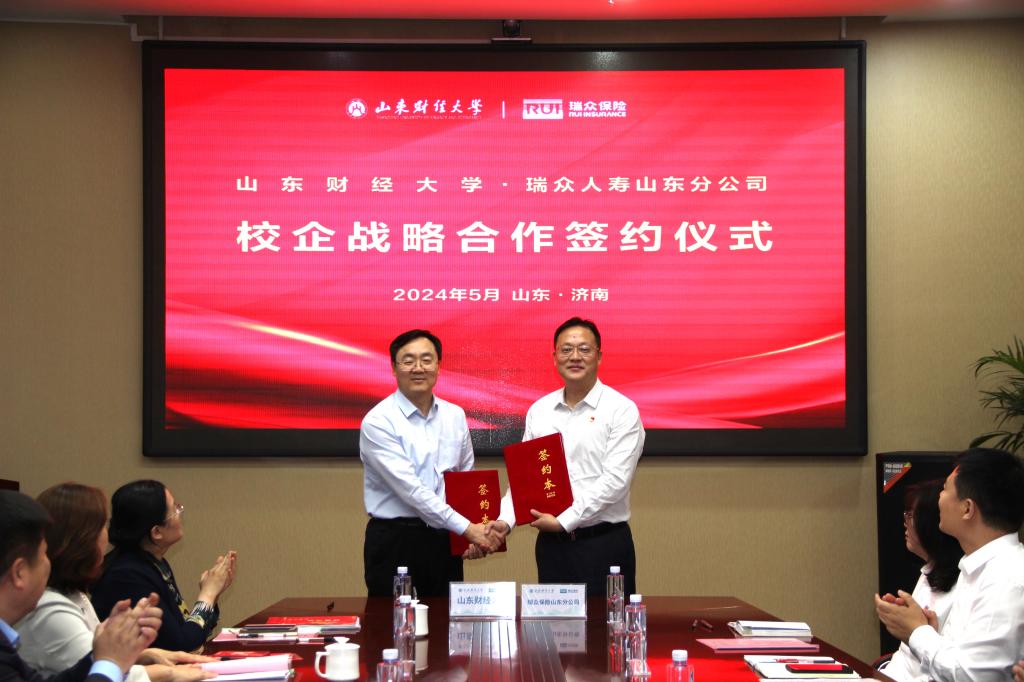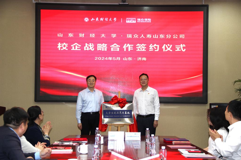5月10日下午,山东财经大学与瑞众人寿山东分公司全面战略合作协议签约暨就业见习基地揭牌仪式在瑞众人寿山东分公司隆重举行。校党委委员、副校长王敬政,瑞众人寿保险山东分公司总经理沈祥和校企双方代表出席签约仪式。