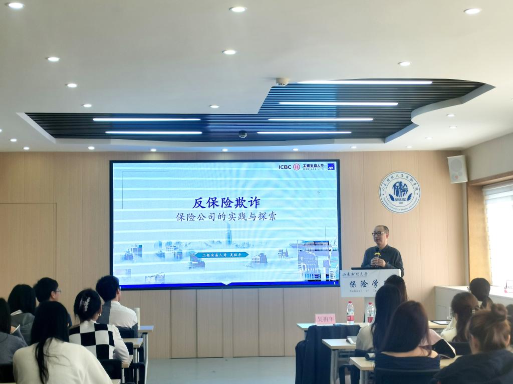 10月8日上午,山东财经大学保险学院特邀工银安盛运营部负责人吴祖年作保险经济学课程专题报告,主题为“反保险欺诈——保险公司的实践与探索”。报告由保险学院院长助理张鹏成主持,保险学院副院长于新亮和50余名2024级保险硕士研究生参会。