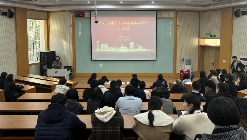 张娟传达了学校《关于在全校开展深入贯彻中央八项规定精神学习教育的通知》的相关精神和要求,并带领党员集体学习了中央八项规定及其实施细则精神。她强调,全院师生党员要充分认识开展此次学习教育的重大意义,认真学习领会习近平总书记的重要讲话和重要指示精神,提高政治站位,高标准、高质量组织开展好这次学习教育,确保学有质量、查有力度、改有成效。