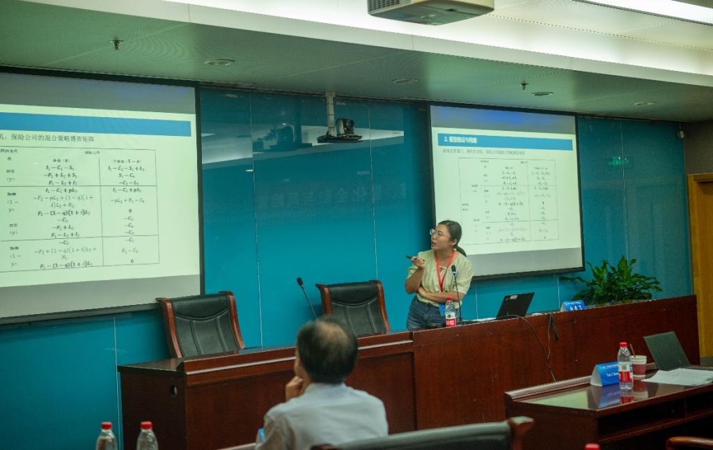 研究生牟佳辉在分论坛上汇报了《Research on the Multi-party Hybrid Game of Investment and Reinsurance Influenced by Big Investors》的研究工作。该研究创新性地考察了大投资者影响下风险资产价格过程的变化特征,深入分析了保险公司与再保险公司在此环境下的博弈行为,为相关领域的风险管理提供了新的研究视角。