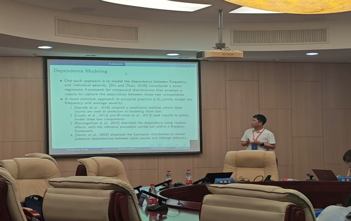 在会议分论坛上,张鹏成作了题为《Spatially Clustered Mixture of Experts Model for Dependent Frequency and Severity of Insurance Claims》的学术报告。该研究创新性地提出了空间聚类专家混合模型(SCMoE),通过引入正则化方法有效处理保险索赔数据中的空间聚类效应,并开发了结合ADMM的MM算法进行模型推断。实证研究表明,该模型在中国医疗保险数据应用中展现出显著的预测性能优势。