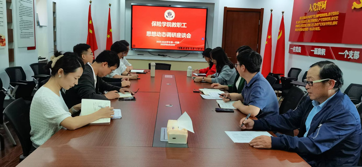 为深入了解教师思想动态,凝聚学院发展共识,9月25日,保险学院组织召开思想动态调研座谈会。学院党委书记张娟、院长于新亮以及各系教师代表共同参会,围绕思想政治建设、教学科研发展与教师关切问题展开深入交流。
