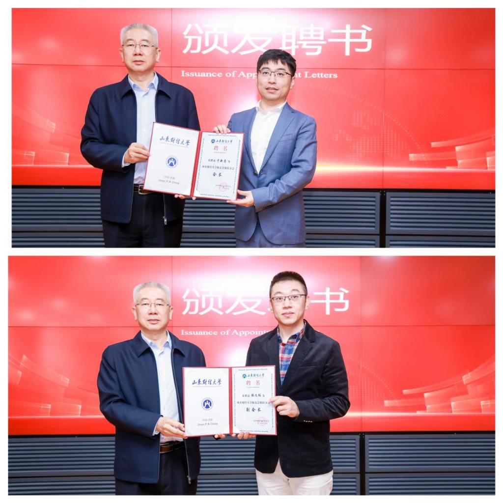 同时,新增两位业界校友担任副会长:太平人寿保险有限公司济南市公司党支部书记、总经理金鲁强,同方全球人寿山东分公司党支部书记滕文韬;保险学院党委副书记王斐斐任秘书长。张新为新任会长于新亮、副会长滕文韬颁发聘书。