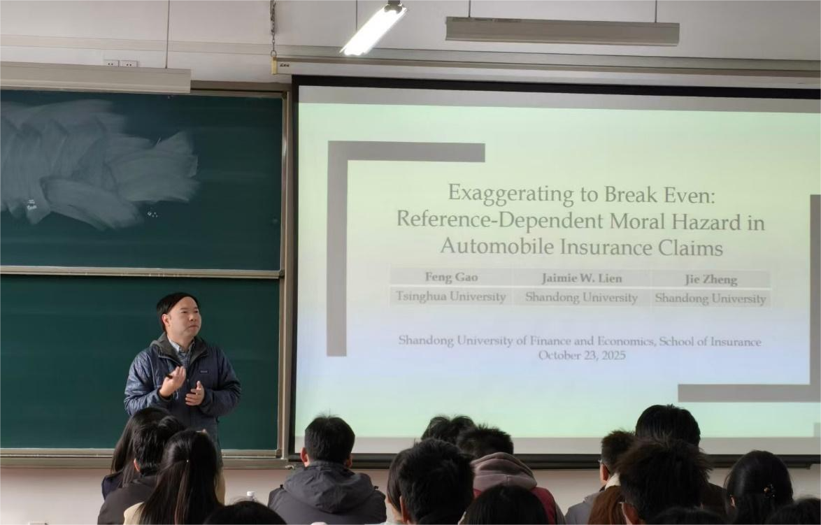 郑教授以《Exaggerating to Break Even: Reference-Dependent Moral Hazard in Automobile Insurance Claims》为题展开学术分享。该研究基于行为经济学参考点依赖理论,对汽车保险市场中的事后道德风险问题进行探讨。通过对中国某大型保险公司索赔数据的分析,研究发现投保人存在系统性夸大索赔金额的行为,普遍将已缴纳保费视为心理参考点,并试图通过索赔行为实现“成本回收”。进一步分析显示,此类操纵行为在高保费、低风险评估、首次索赔及保单后期索赔中更为集中,且主要出现在私家车保单中。该研究首次将参考点依赖理论应用于保险道德风险的识别,为检测道德风险提供了全新的行为经济学视角。