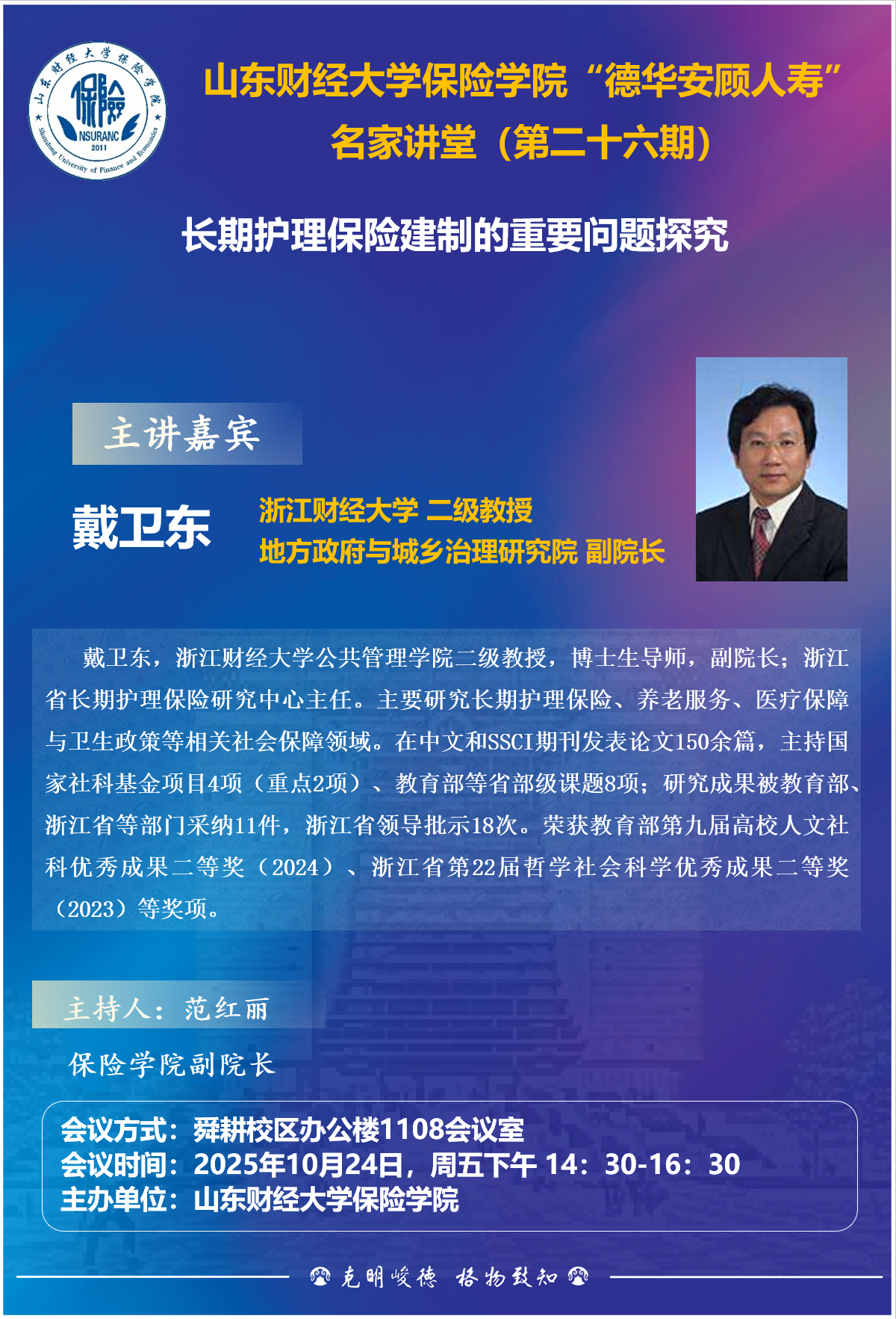 山东财经大学保险学院“德华安顾人寿”名家讲堂(第二十六期),10月24日,14:30,报告人:戴卫东
