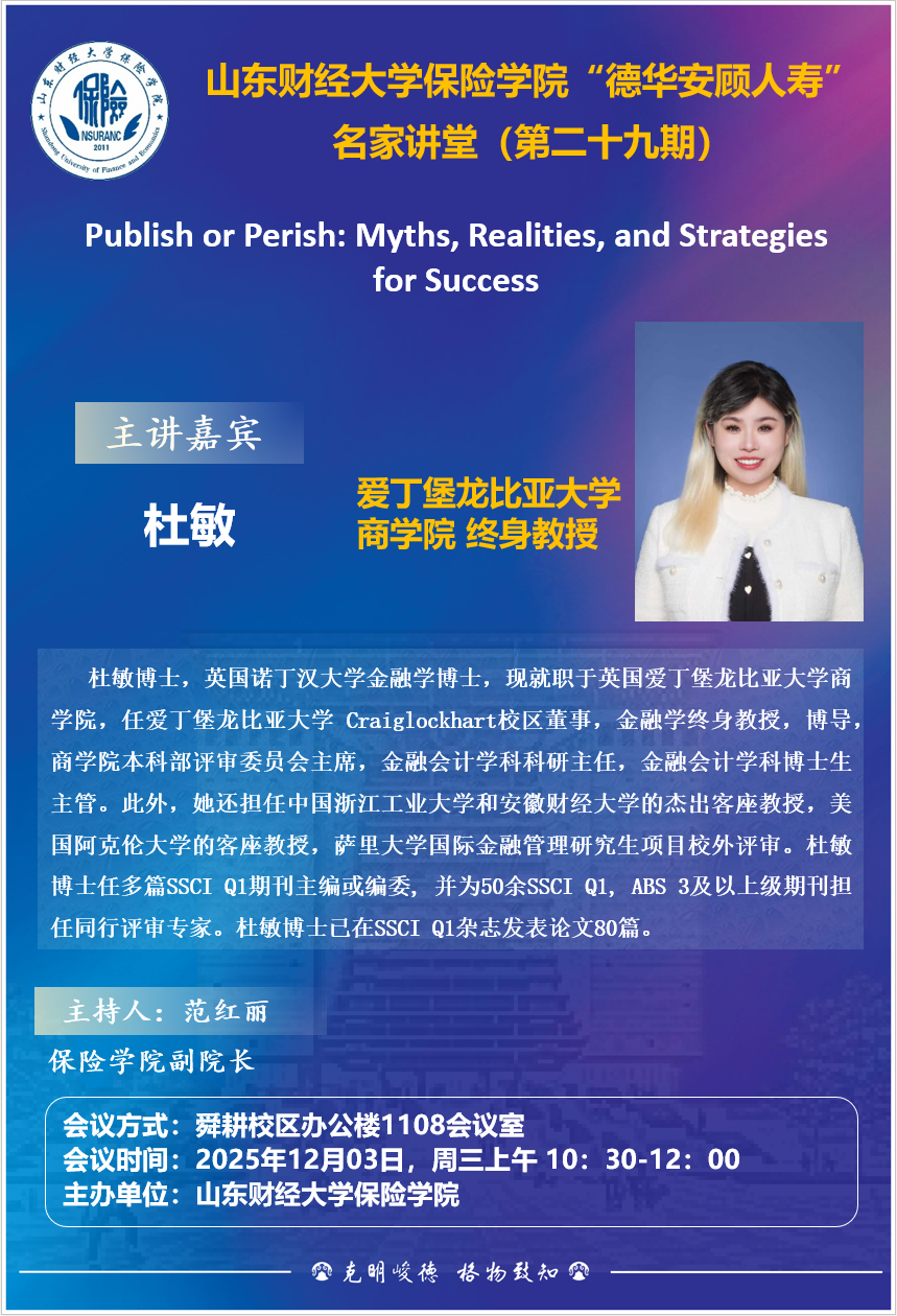 山东财经大学保险学院“德华安顾人寿”名家讲堂(第二十九期),12月3日,10:30,报告人:杜敏
